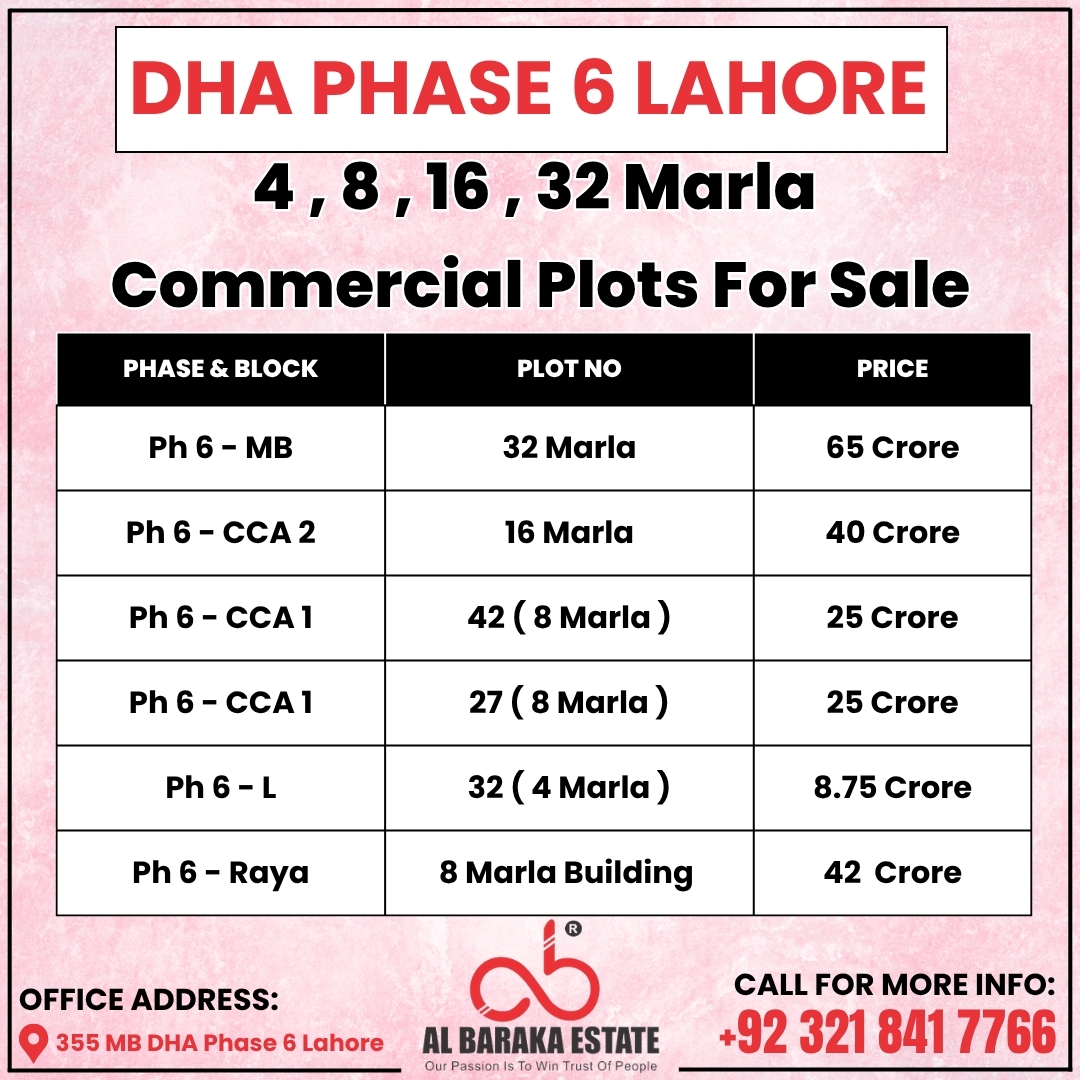 An exceptional opportunity to own prime commercial plots in the heart of DHA Phase 6 Lahore. Perfect for retail outlets, offices, showrooms, or long-term investment in one of Lahoreโs busiest and most prestigious locations.